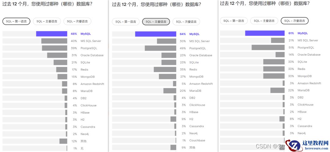 这一小节,主要是统计了数据库管理工具,这个列的还是比较全的,MySQL Workbench、命令行这两个方式依然占在前三位置,从这看来依然有部分程序员更喜欢用命令行界面去操作数据库,不一定非得给个可视化前端界面~