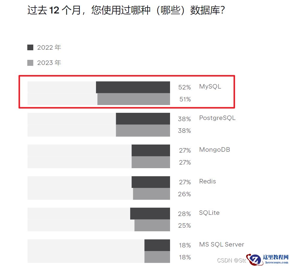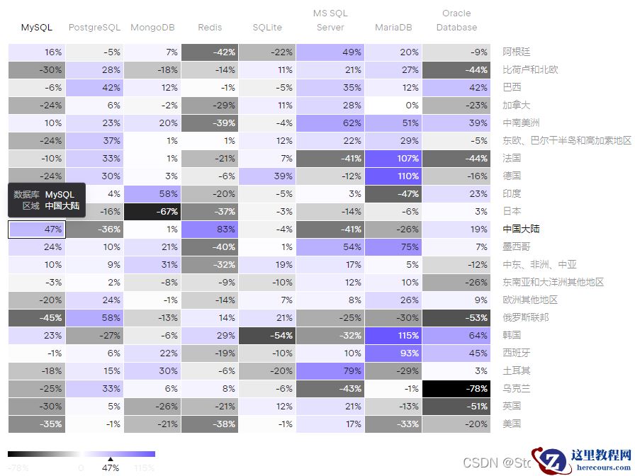MySQL 在中国大陆的相对受欢迎程度非常高,占据了 47%,受欢迎度排名第二;而首位的则是 Redis,达到了 83%;而 PostgreSQL 则是 -36%,