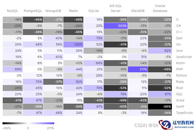 “相对受欢迎程度”是指一种数据库在某种编程语言的用户中的受欢迎程度相对于它在一般情况下的受欢迎程度。例如,MongoDB 在 Python 用户中的份额为 29.2%,而其一般份额为 26.6%。将差值 (+2.6%) 除以 26.6%,我们得到 +10%。我们称之为 MongoDB 在 Python 开发者中的相对受欢迎程度。