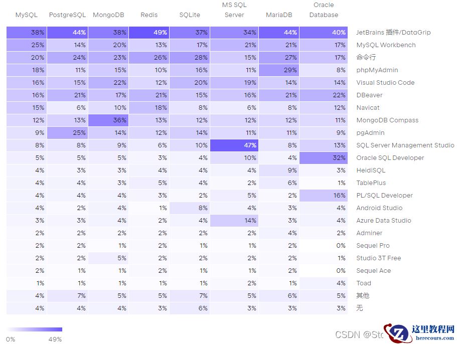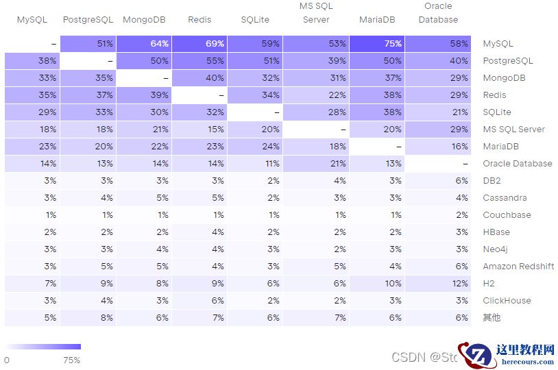 最后一个相关的图表是比较有趣的,在这个相关表中,每个值表示有多少列所示数据库用户同样使用行所示数据库。例如,有 38% 的 MySQL 用户同样使用 PostgreSQL,而 51% 的 PostgreSQL 用户同样使用 MySQL。