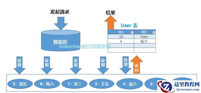如图,经过顺序查找、进行 5 次寻址,查询到了 ID 为【 4 、赵六】的数据。