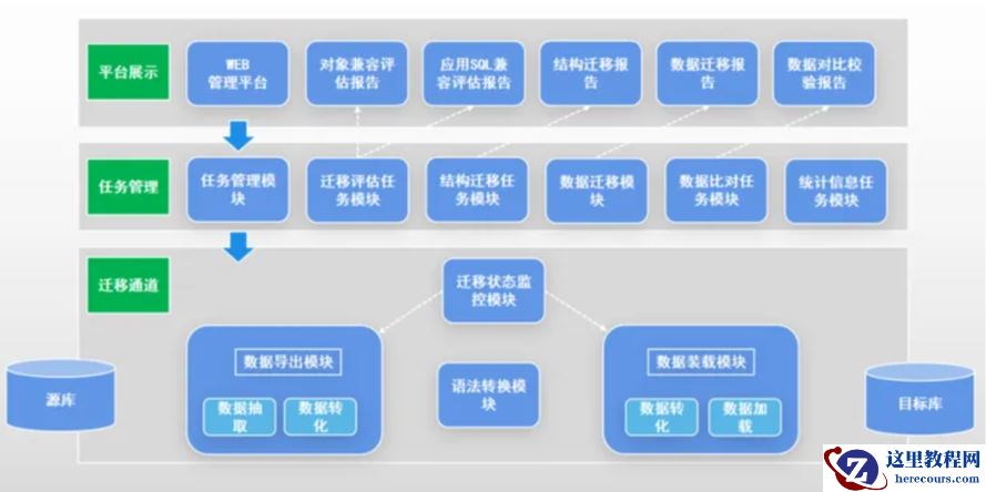 TMS 功能架构 :TMS 的功能架构如下图所示,除了可视化控制台,还包括任务管理和迁移通道两层功能模块,用于解决数据库迁移中的任务管理需求和技术实现。