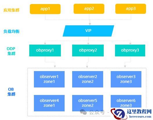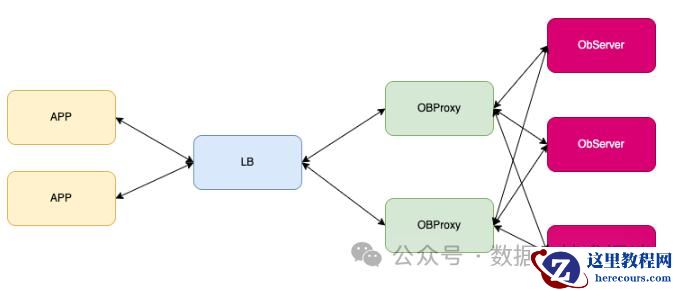 多个 OBProxy 虽然称为 ODP 集群,实际上并无集群的基本能力(高可用和负载均衡)。每个 OBProxy 独立工作,都可以访问到 OceanBase 集群。ODP 集群的高可用和负载均衡要借助于负载均衡设备(LB 设备,如 F5、A10 或 SLB、LVS)。很多分布式数据库都有这个设计。