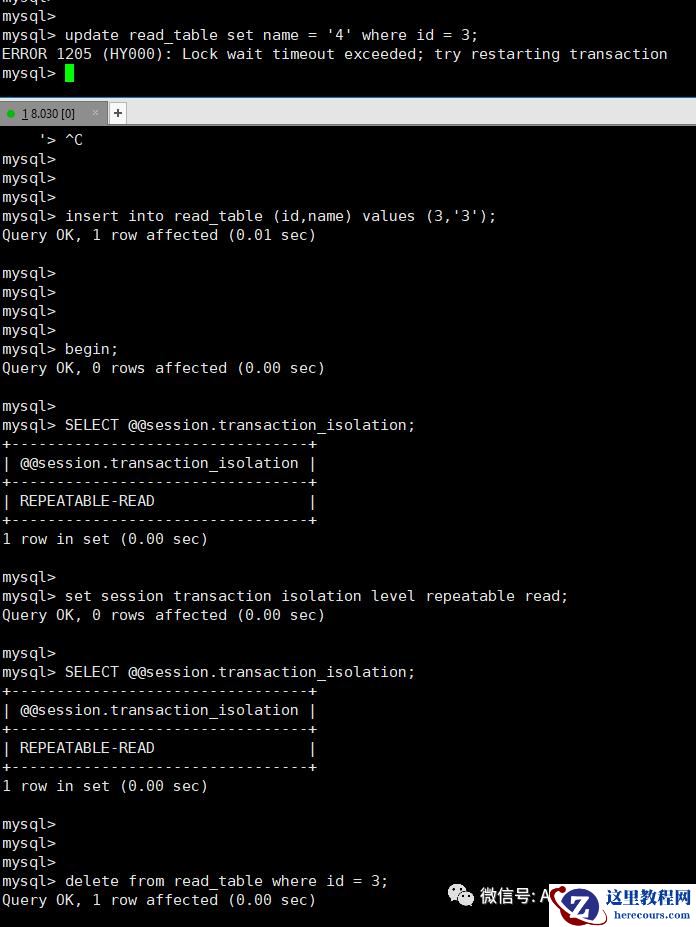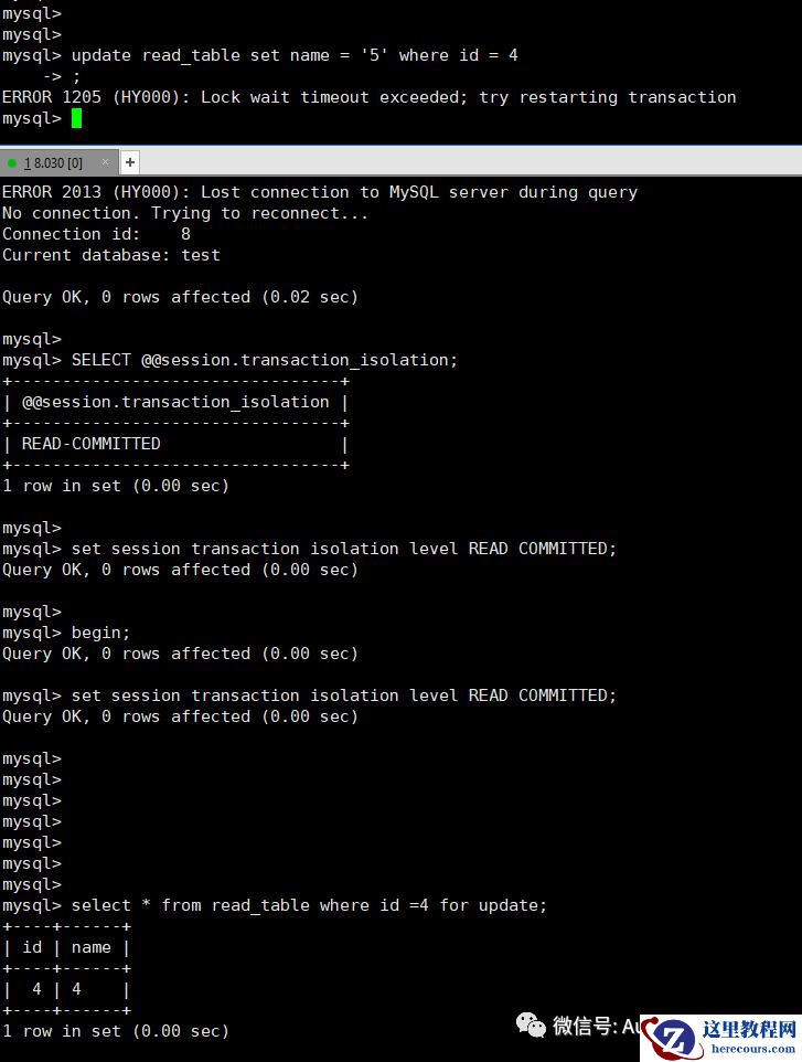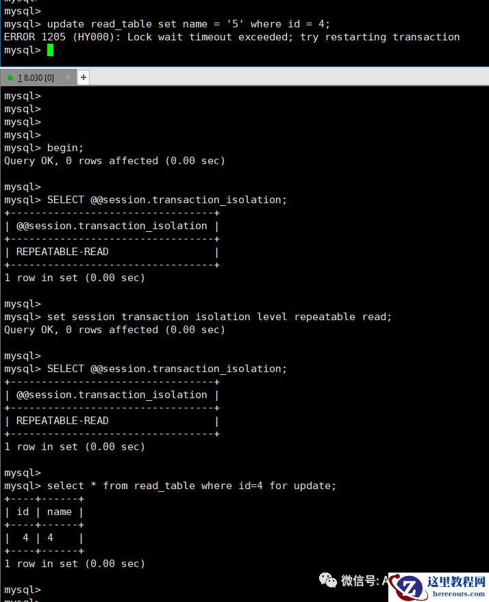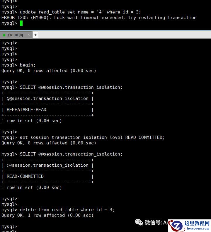 在MYSQL 配置中如果使用的 innodb_lock_wait_timeout =3 的配置的情况下,在很短的时间数据库就能判断出BLOCKED 或死锁,在这样的情况下,无论使用什么隔离级别,那么结果都是一样的,都会是锁超时的报错和让你重试的信息。