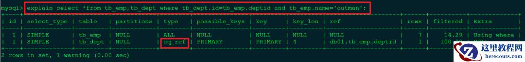 注:对于system和const可能实际意义并不是很大,因为单表单行查询本来就快,意义不大。 2> eq_ref 唯/一索引扫描,对于每个索引键,表中只有一条记录与之匹配。常见主键或唯/一索引扫描。
