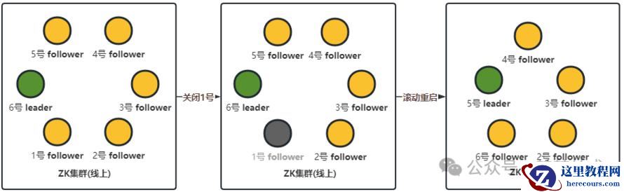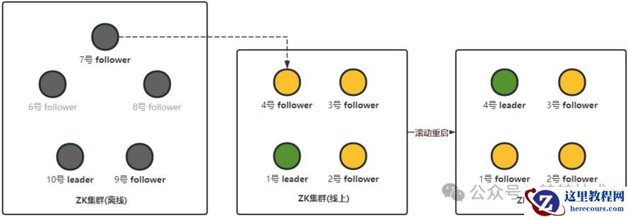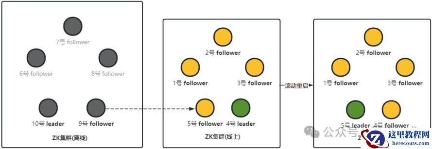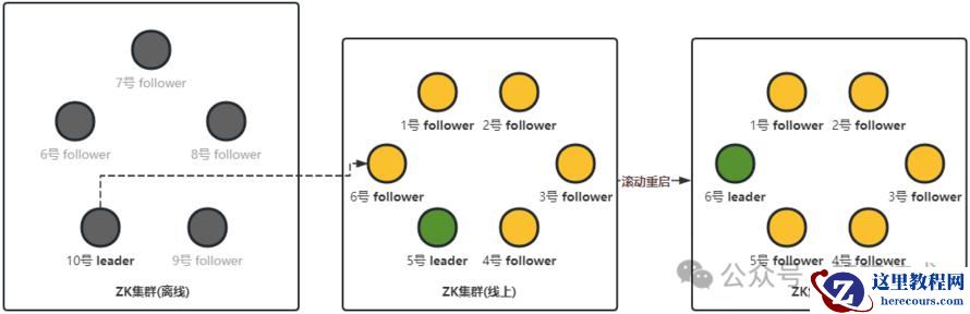 老ZK集群节点6号/7号/8号/9号/10号都必须在实例本机ZooKeeper-3.4.13版本新工作路径操作节点替换,业务客户端缓存的ZK节点DNS解析IP地址不能变。