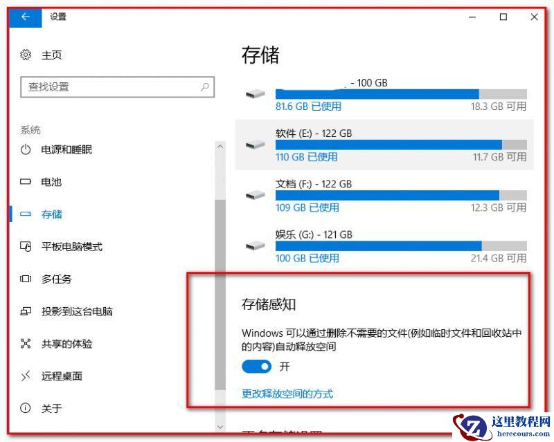 依次进入Win10「设置」→「系统」→「存储」,然后开启「储存感知功能」,就可以让Windows自动清理临时文件。