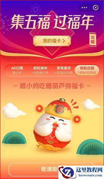 这个游戏是支付宝里的一个佛系游戏,去年支付宝集福的时候,蚂蚁庄园的鸡下的是金蛋,收到金蛋就能随机收到一张福卡,今年,喂小鸡吃糖葫芦也能得福卡,1 月 31 日敬请期待!