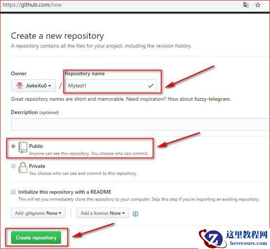 填写你的库名称,然后点击绿色按钮 create repository 创建项目。这里写成了 Mytest1,因为之前已经创建了,你可以写成 Mytest 或者自定义。