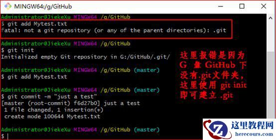 这里报错是因为 G 盘 GitHub下没有 .git 文件夹,这里使用 git init 即可建立