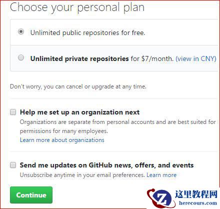 这时会弹出一个界面,让你选择你的私人计划(personal plan),即选择免费用户还是付费用户,付费用户可以拥有私人代码仓库(repos),即别人不能查看你的代码,免费用户的仓库是公开的,任何人都能查看。