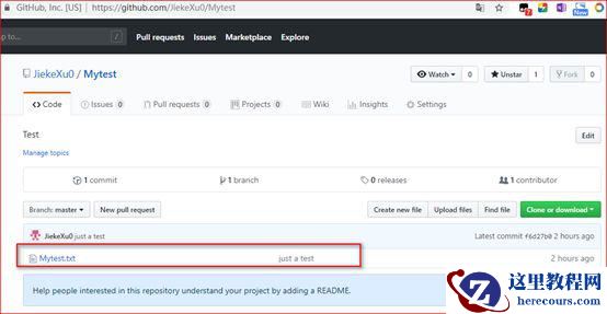 JiekeXu0 是我注册的账号,这时再看 GitHub 中的 Mytest 仓库,发现多了一个 Mytest.txt 文件。
