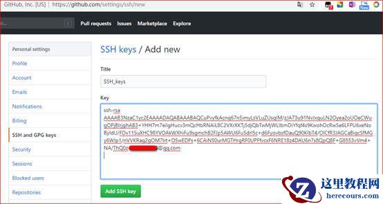 其中 Title 中的名称可以任意填写,将 C:\Users\Administrator\.ssh 目录下 id_rsa.pub 复制的所有内容粘贴到 Key 中,点击 Add SSH Key,SSH密钥完成。