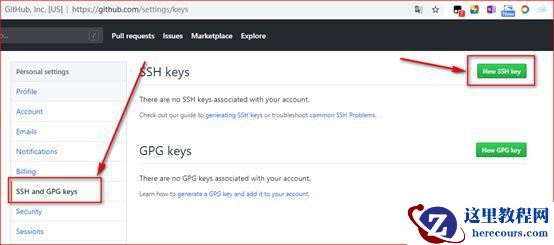选择 SSH and GPG keys 并新建一个 SSH Key