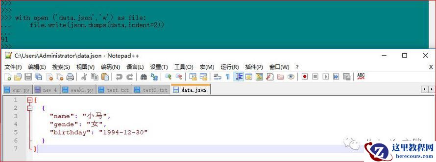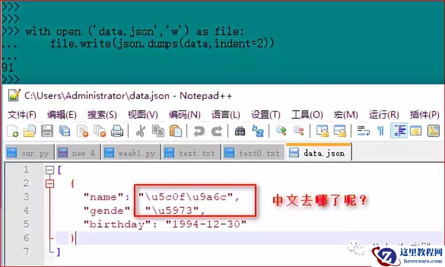 看到这样的内容,肯定不是我们想要的结果啊,中文字符都变成了Unicode字符,那么,为了显示中文字符,还需要指定参数ensure_asci为 False,另外还需要规定输出文件的编码。这样就可以完美的将中文显示出来了,如下图所示。
