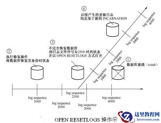 数据库在日志文件序号为 1000 时创建了备份,在日志文件序号为 4000 时崩溃,由于日志文件序号为 2501,因此你只能将数据库恢复到日志文件序号为 2500 时的状态,然后以 RESETLOGS 方式打开,Oracle 数据库又开始了一个新的 Incarnation,日志文件序号被重新初始化到 1,然后随着数据库的运行不断增加并达到 4000,但这些日志文件与之前的日志文件并不关联(虽然文件序号相同)。