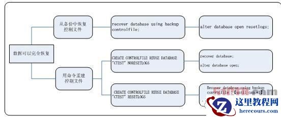 Oracle 官方文档中也提到,一旦用备份的控制文件进行数据库恢复,就需要使用 resetlogs 的方法打开数据库,但是 resetlogs 通常意味着不完全恢复,而且更重要的是一旦用 resetlogs 方法打开数据库,日志的序号用重新从 1 开始。其实如果只是控制文件损坏,日志文件都完整的话,数据库是可以完全恢复的,而且不必非得用 resetlogs 打开。接下来,我们就对不完全恢复做出总结,如下图所示,然后再通过一些实验深入理解。
