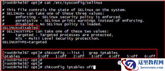 设置 selinux 为 disable 并重启操作系统;用 chkconfig iptables off 命令关闭防火墙,如下图所示。