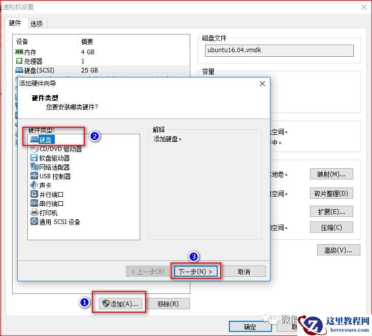 因我使用的虚拟化软件是 VM ware ,那么添加一块硬盘也是很容易的事情,首先虚拟机是在你的宿主机上,得保证你宿主机磁盘空间充足(例如 D 盘、E 盘、F 盘等),然后打开虚拟机的【设置】添加硬盘,然后选择下一步,如下图: