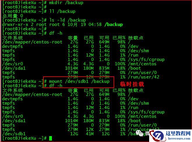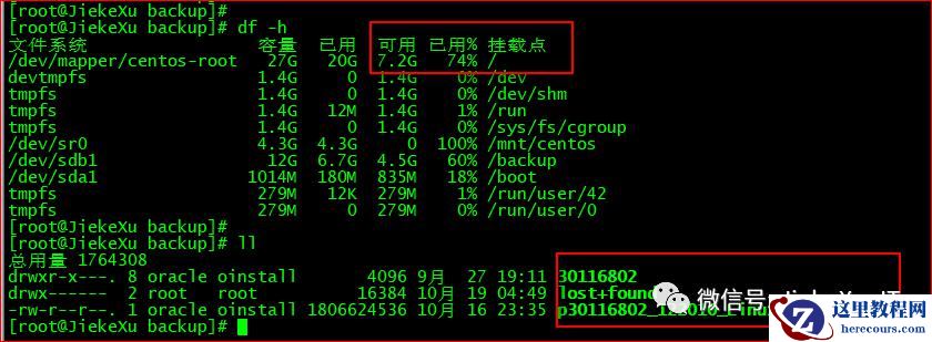 [root@JiekeXu ~]# df -h文件系统 容量 已用 可用 已用% 挂载点/dev/mapper/centos-root 27G 27G 649M 98% /devtmpfs 1.4G 0 1.4G 0% /devtmpfs 1.4G 0 1.4G 0% /dev/shmtmpfs 1.4G 12M 1.4G 1% /runtmpfs 1.4G 0 1.4G 0% /sys/fs/cgroup/dev/sr0 4.3G 4.3G 0 100% /mnt/centos/dev/sdb1 12G 41M 12G 1% /backup/dev/sda1 1014M 180M 835M 18% /boottmpfs 279M 12K 279M 1% /run/user/42tmpfs 279M 0 279M 0% /run/user/0[root@JiekeXu ~]# cd /u01/software/[root@JiekeXu software]# ll总用量 1764288drwxr-x---. 8 oracle oinstall 159 9月 27 19:11 30116802-rw-r--r--. 1 oracle oinstall 1806624536 10月 16 23:35 p30116802_122010_Linux-x86-64.zipdrwxrwxr-x. 8 500 500 4096 9月 23 17:04 rlwrap-0.37[root@JiekeXu software]# mv p30116802_122010_Linux-x86-64.zip /backup/[root@JiekeXu software]# mv 30116802/ /backup/