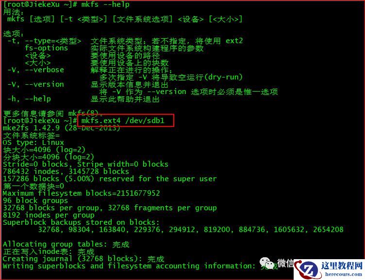 mkfs 格式化,创建文件系统,注意这里创建的文件系统类型 ext4 。默认 CentOS 7 的文件系统类型为 xfs,不过这里不作为数据盘,使用上无区别。