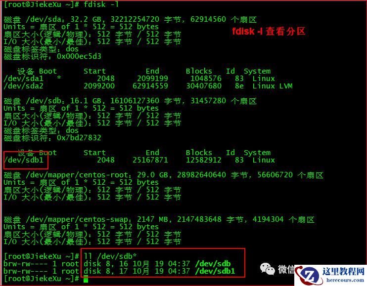 使用 fdisk -l 命令查看分区。ll 查看对应的设备