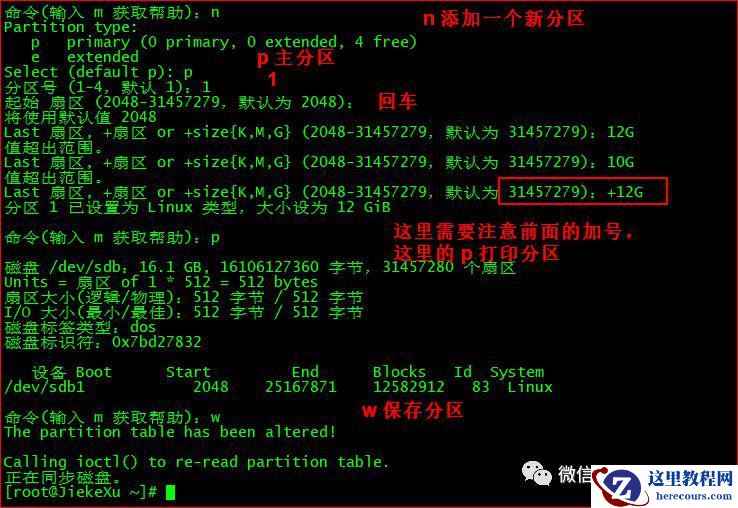 n 添加新分区 p 主分区 1 first sector 默认回车 laster sector 输入分区大小 +12G