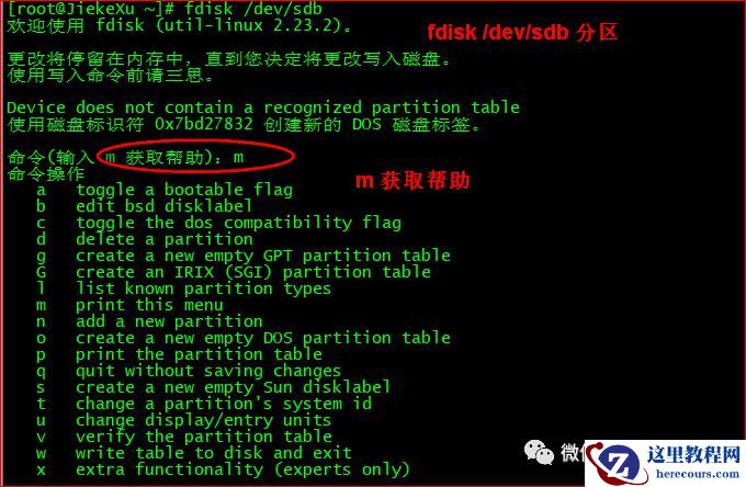 如上,已经查到了对应磁盘为 /dev/sdb,那么则使用 fdisk 对其进行分区,fdisk /dev/sdb 命令进行分区,输入 m 获取帮助。