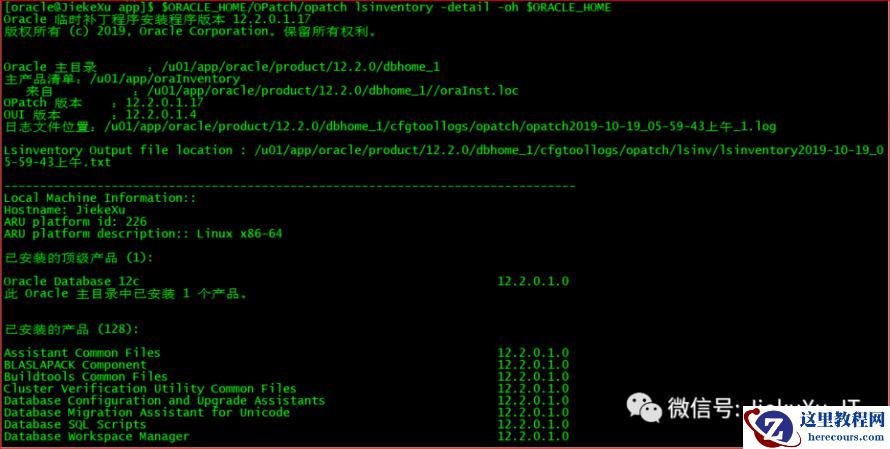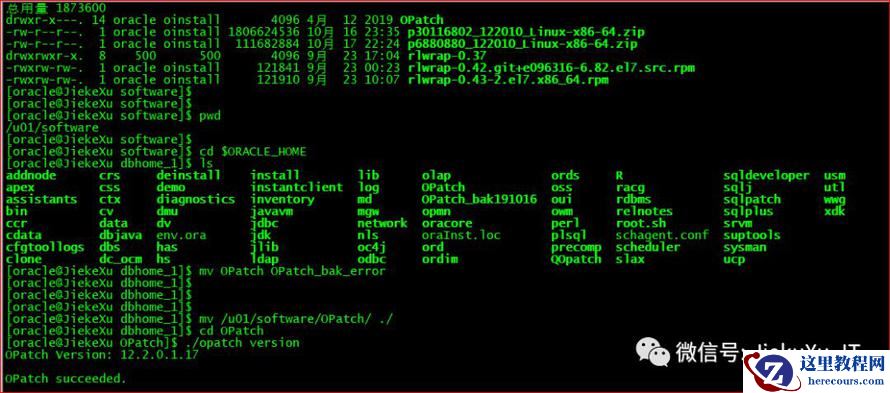 [oracle@JiekeXu dbhome_1]$ cd $ORACLE_HOME/OPatch[oracle@JiekeXu OPatch]$ ./opatch versionOPatch Version: 12.2.0.1.17OPatch succeeded.
