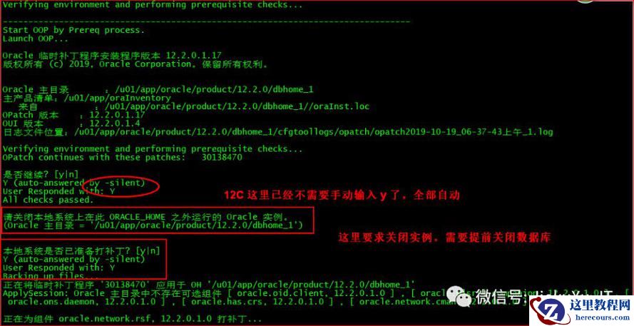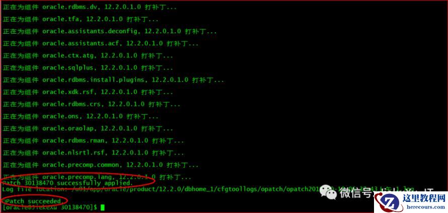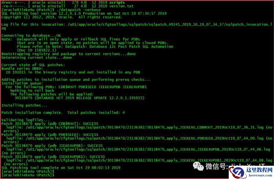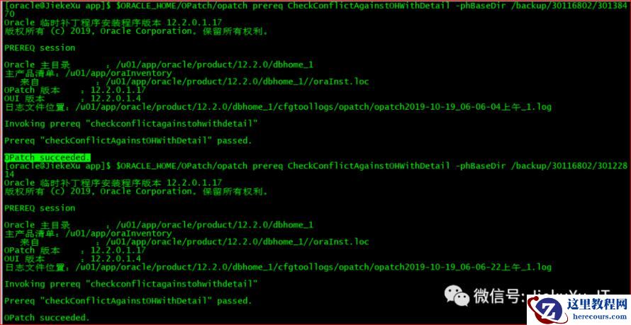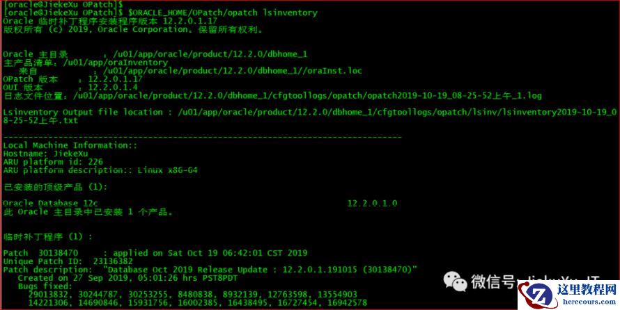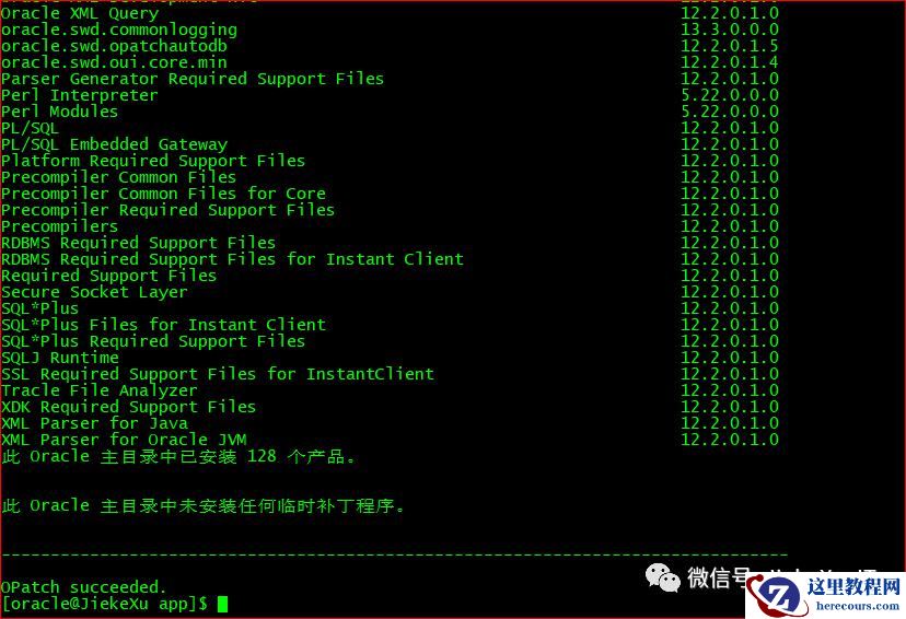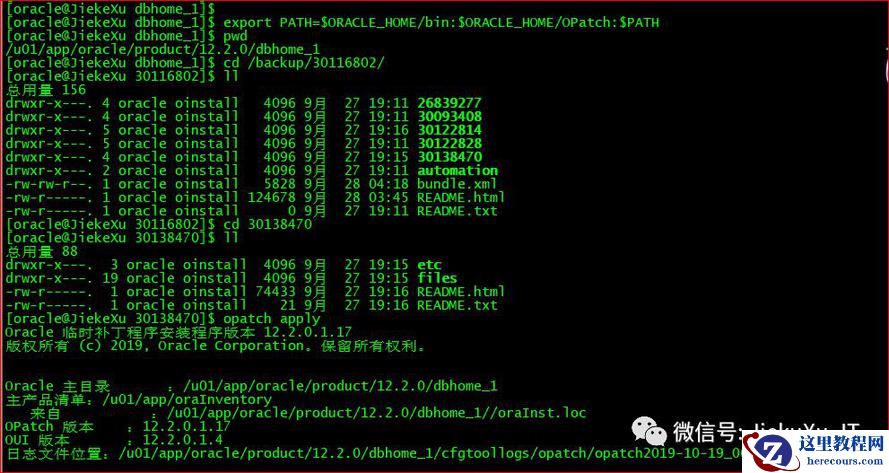 [oracle@JiekeXu 30116802]$ exportPATH=$ORACLE_HOME/bin:$ORACLE_HOME/OPatch:$PATH[oracle@JiekeXu 30116802]$ cd /backup/30116802/30138470[oracle@JiekeXu 30138470]$ ll总用量 88drwxr-x---. 3 oracle oinstall 4096 9月 27 19:15 etcdrwxr-x---. 19 oracle oinstall 4096 9月 27 19:15 files-rw-r-----. 1 oracle oinstall 74433 9月 27 19:16 README.html-rw-r-----. 1 oracle oinstall 21 9月 27 19:16 README.txt[oracle@JiekeXu 30138470]$ opatch apply