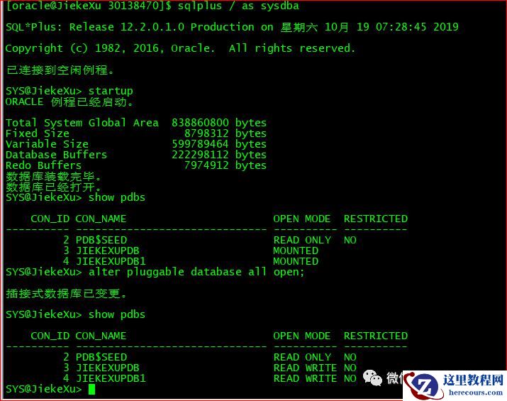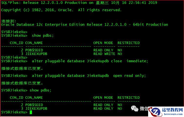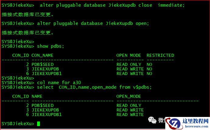 alter pluggable database JiekeXupdb close immediate;alter pluggable database JiekeXupdb open;show pdbs;select CON_ID,name,open_mode from v$pdbs;#alter pluggable database all open; #其实也可使用此命令打开所有的PDB,指定名称单独打开一个PDB