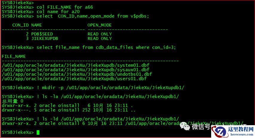 mkdir -p /u01/app/oracle/oradata/JiekeXu/JiekeXupdb1/ls -ld /u01/app/oracle/oradata/JiekeXu/JiekeXupdb1/