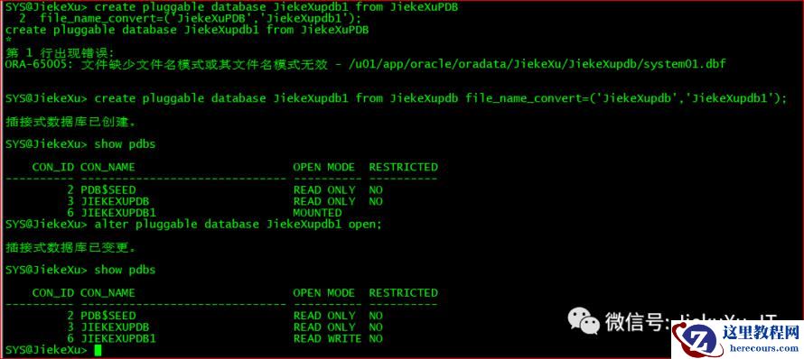 create pluggable database JiekeXupdb1 from JiekeXupdb file_name_convert=('JiekeXupdb','JiekeXupdb1');alter pluggable database JiekeXupdb1 open;注意:这里的PDB实例名的大小写,如出现下列错误,导致 con_id 为 6 ,说明 4、5 出现了错误。