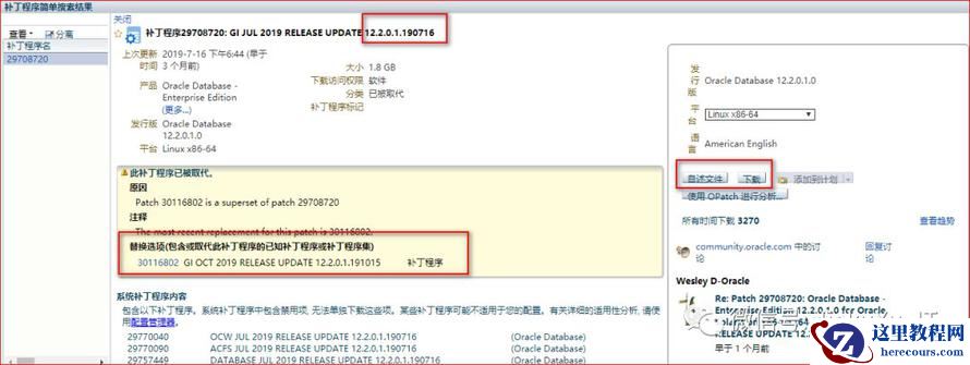本次使用的补丁号为 p29708720,这是我国庆期间下载的补丁集,但是等我今天刚登陆上去查看时,第四季度的补丁也已经发布了,还可以免费下载,补丁号为 30116802。