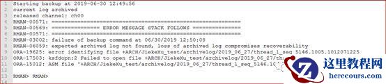 事情是这样的,上周六中午刚要出去吃饭,便看到微信群里备份工程师的微信消息,说某套环境备份失败,让 DBA 检查下环境,我猜想这不是什么大问题,便不慌不忙的登陆到服务器上,打开备份的日志查看,果然不是什么大问题,之前也出现过类似的问题。结果日志中出现很明显、很关键的几个错误,如:RMAN-03002 、RMAN-06059、ORA-19625、ORA-17053、ORA-15012,日志报错如下截图: