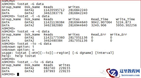ASMCMD> iostat -G dataGroup_Name Dsk_Name Reads Writes DATA DATA1 11420595712 2816842240 DATA DATA2 3462283776 2816842240 ASMCMD> iostat -t -G dataGroup_Name Dsk_Name Reads Writes Read_Time Write_Time DATA DATA1 11421136384 2816944640 9042.907064 5224.873 DATA DATA2 3462382080 2816944640 3240.906 5950.302256 ASMCMD>ASMCMD> iostat -e -G dataGroup_Name Dsk_Name Reads Writes Read_Err Write_Err DATA DATA1 11421775360 2817051136 0 0 DATA DATA2 3462480384 2817051136 0 0 ASMCMD>ASMCMD> iostat --io -G dataGroup_Name Dsk_Name Reads Writes DATA DATA1 682740 229155 DATA DATA2 197993 229155 ASMCMD>