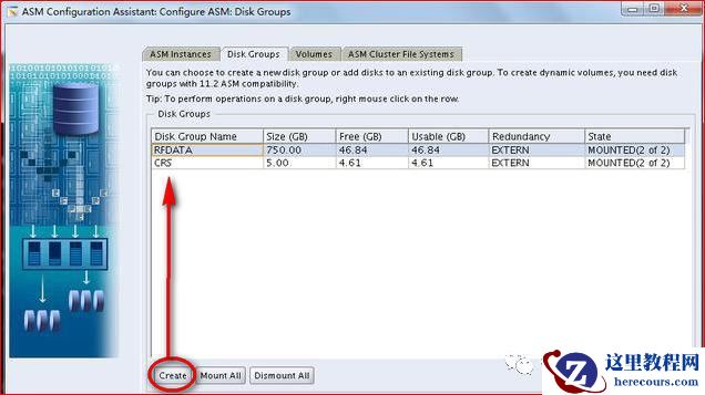 当安装完 grid 的时候,可使用命令行 asmca 来创建磁盘组,如下图:
