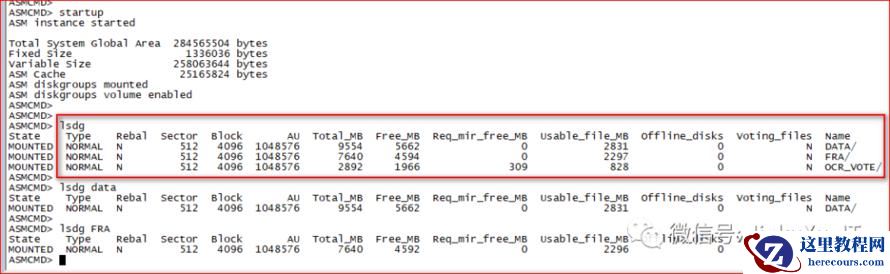 ASMCMD 工具命令行中的 lsdg 可以查看磁盘组的详细信息,如状态、冗余级别、是否正在进行重新平衡、总大小、剩余空间等。这个命令的信息则是来自动态性能视图 V$ASM_DISKGROUP 的,如下所示: