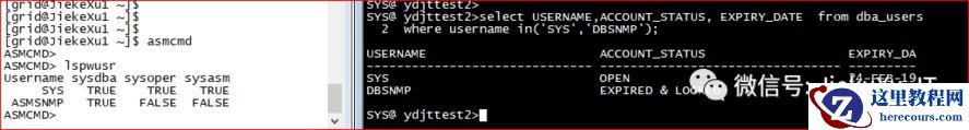 SYS@ ydjttest2>select USERNAME,ACCOUNT_STATUS, EXPIRY_DATE from dba_users where username in('SYS','DBSNMP');USERNAME ACCOUNT_STATUS EXPIRY_DA------------------------------ -------------------------------- ---------SYS OPEN 24-FEB-19DBSNMP EXPIRED & LOCKED 13-AUG-09[grid@JiekeXu1 ~]$ asmcmdASMCMD>ASMCMD> lspwusrUsername sysdba sysoper sysasm SYS TRUE TRUE TRUEASMSNMP TRUE FALSE FALSEASMCMD>