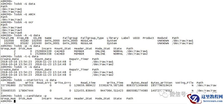 lsdsk 可查看磁盘组中的磁盘或者系统中可用的磁盘。这个命令也有 -k、-p、-t、--statistics 等几个参数可以获得不同的信息,选项 -k 可以看到总大小以及剩余大小,磁盘名以及磁盘对应操作系统路径等。 选项 -p 可以看到磁盘组序号,磁盘状态以及磁盘冗余度和路径等等信息。选项 -t 则是查看磁盘创建时间以及挂载时间和路径等信息。选项 --statistics 则是查看磁盘组中读写 IO 信息,包括在每个磁盘上的读和写的次数、所用时间和数据量以及磁盘路径等信息。而这些信息主要来自于动态性能视图 V$ASM_DISK 和 V$ASM_DISK_STAT。部分举例如下图所示。