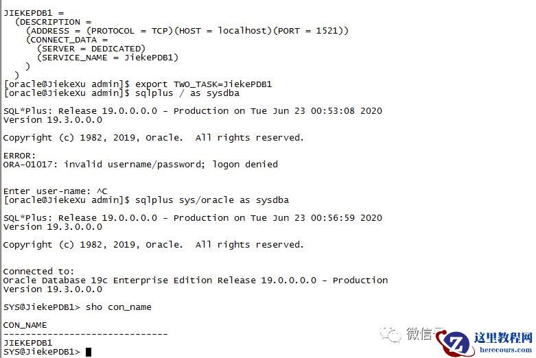 不可以使用 export ORACLE_SID=JIEKEPDB1 的方式连接 PDB,因为实例只有一个,对应的 SID 是 JiekeCDB,不存在 Jiekepdb1 实例。但是 18c 、19c 可以使用 ORACLE_PDB_SID 来连接到 PDB,直接登录到数据库。