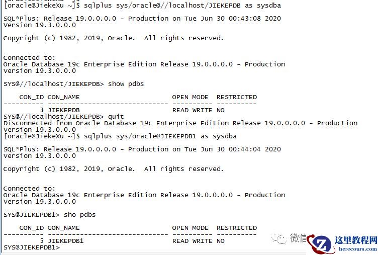 sqlplus sys/oracle@JIEKEPDB1 as sysdba