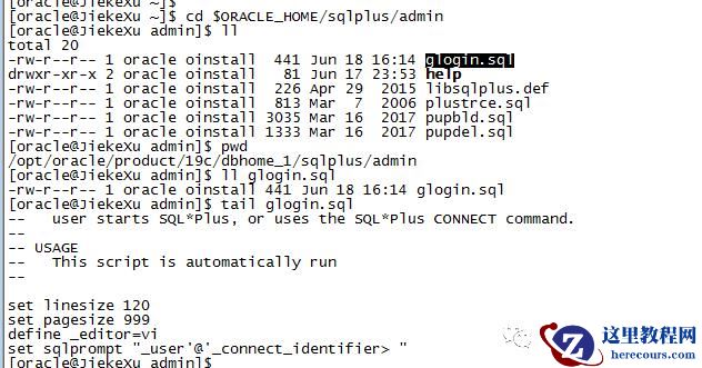 如上图,当我使用 sqlplus 连接到 PDB 时,每行 SQL 前均会显示所连接到的容器租户以及用户名称,如 SYS@JIEKEPDB1> .这个命令提示符是可以配置的。在 $ORACLE_HOME/sqlplus/admin 目录下有一个 glogin.sql 文件,在最后添加 sqlprompt 相关的提示便可以了。