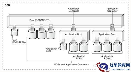 3)零个或多个应用程序容器:应用程序容器仅由一个 application root 和插入到这个根的 PDB 组成。系统容器包含 CDB 根目录和CDB中的所有 PDB,而应用程序容器只包含插入到应用程序根目录中的PDB。application root 属于 CDB 根,不属于其他容器。