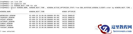 SYS@PROD1> set line 234SYS@PROD1> set pagesize 120SYS@PROD1> col WINDOW_NEXT_TIME fora34SYS@PROD1> select WINDOW_NAME,WINDOW_NEXT_TIME , WINDOW_ACTIVE,OPTIMIZER_STATS from DBA_AUTOTASK_WINDOW_CLIENTS order by WINDOW_NEXT_TIME ;WINDOW_NAME WINDOW_NEXT_TIME WINDO OPTIMIZE---------------------------------------------------------------- ----- --------WEDNESDAY_WINDOW 01-APR-20 10.00.00.000000 PMPRC FALSE ENABLEDTHURSDAY_WINDOW 02-APR-20 10.00.00.000000 PMPRC FALSE ENABLEDFRIDAY_WINDOW 03-APR-20 10.00.00.000000 PMPRC FALSE ENABLEDSATURDAY_WINDOW 04-APR-20 06.00.00.000000 AMPRC FALSE ENABLEDSUNDAY_WINDOW 05-APR-20 06.00.00.000000 AMPRC FALSE ENABLEDMONDAY_WINDOW 06-APR-20 10.00.00.000000 PMPRC FALSE ENABLEDTUESDAY_WINDOW 07-APR-20 10.00.00.000000 PMPRC FALSE ENABLED7 rows selected.