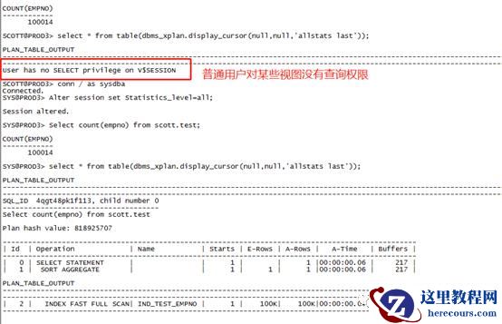这里值得说明的是当普通用户使用此命令查看执行计划时则会报错,原因是系统缺少角色 PLUSTRACE.需要执行脚本 plustrce.sql 脚本,执行完脚本后将此角色授予给普通用户则可以查看。