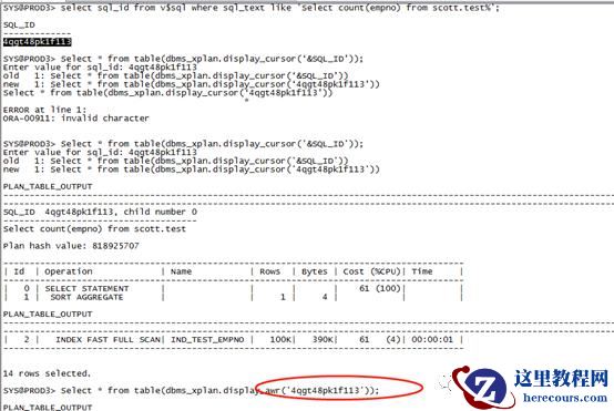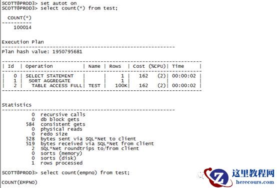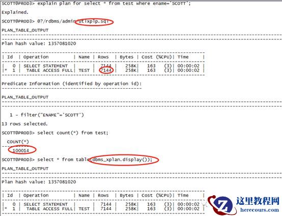 explain plan for select * from test whereename='SCOTT';@?/rdbms/admin/utlxplp.sqlSelect count(*) from test;select * from table(dbms_xplan.display());