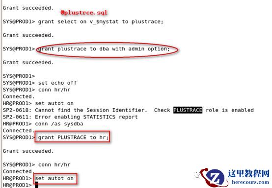 set echo ondrop role plustrace;create role plustrace;grant select on v_$sesstat to plustrace;grant select on v_$statname to plustrace;grant select on v_$mystat to plustrace;grant plustrace to dba with admin option;set echo off