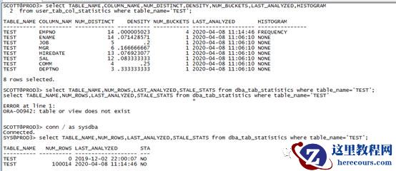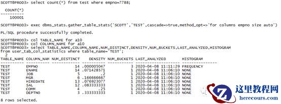 col TABLE_NAME for a10col COLUMN_NAME for a10select TABLE_NAME,COLUMN_NAME,NUM_DISTINCT,DENSITY,NUM_BUCKETS,LAST_ANALYZED,HISTOGRAM from user_tab_col_statisticswhere table_name='TEST';