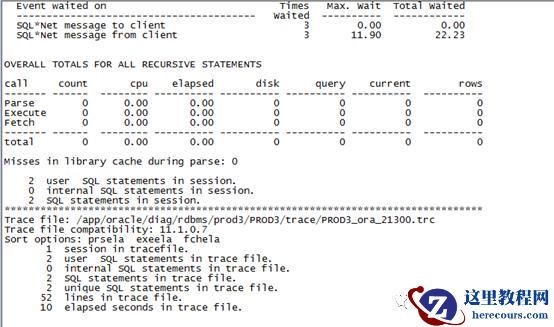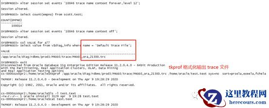 Alter session set events ‘10046 trace namecontext forever,level 12’;Select count(empno) from scott.test;Alter session set events ‘10046 trace namecontext off’;Select value from v$diag_info where name=’Default Trace File’;Tkprof XXXX/21300.trc test.text sys=nosort=prsela,exeela,fchela